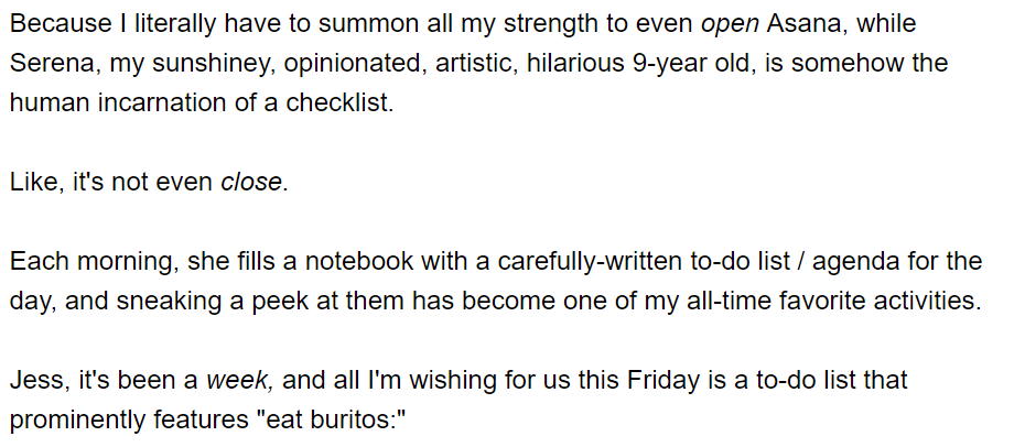 She then explains, in detail, real feelings and emotions… how she feels when she looks at her daughter’s list and the feeling she experiences in wanting that single thing to look forward to (burritos, of course) at the end of her crazy week.