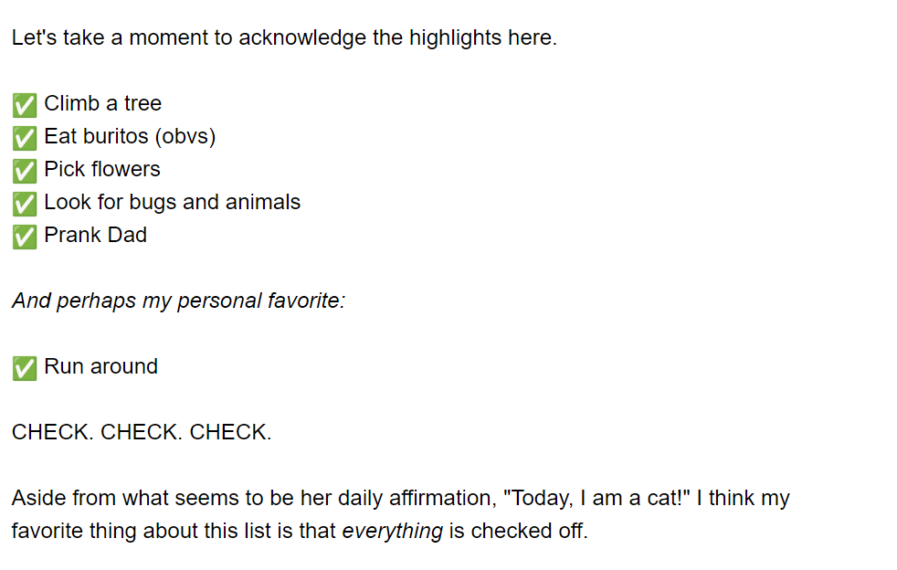 That she’s going to go “run around” as her daughter had listed on the checklist. Little touches like this just make the email feel human.